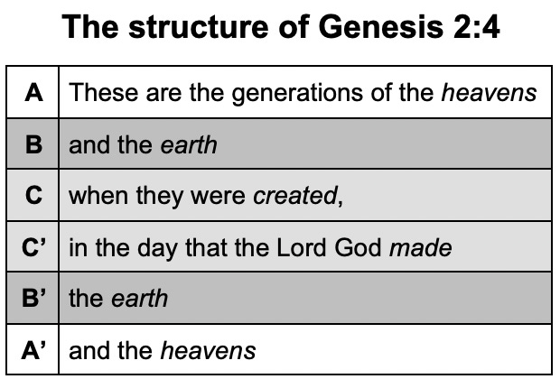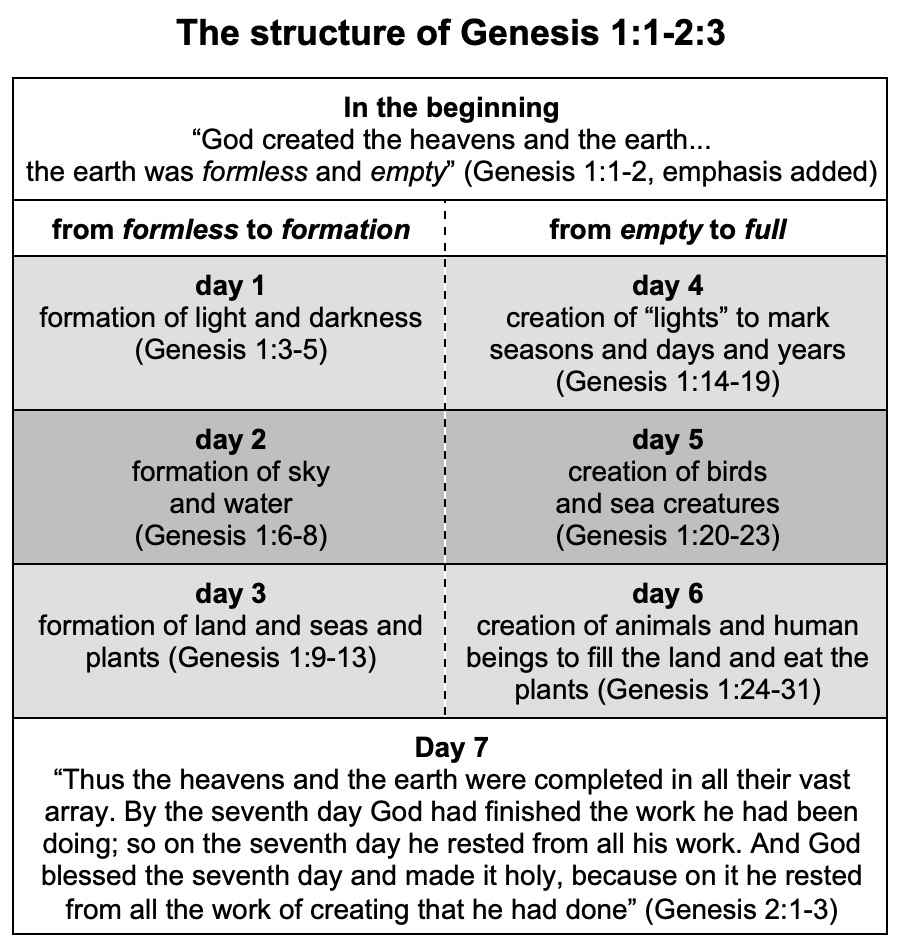 The prologue provides an overview of creation. As can be seen from the table below, the passage is carefully structured. In particular, we may note the parallels between days 1 and 4, days 2 and 5, and days 3 and 6.