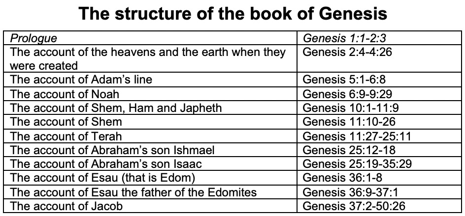 The book of Genesis can be considered as consisting of a prologue followed by eleven sections, each of which begins “This is the account of…” (NIV) or, more literally, “These are the generations of…” (ESV). In this chapter, we shall be concerned mainly with the prologue and the first of these eleven sections.