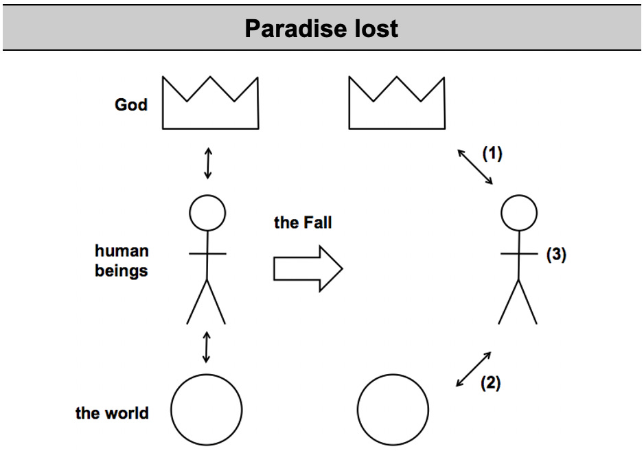 The first two chapters of Genesis present a picture of paradise: an ordered and purposeful world created by a good God in which his people live in his place under his rule. In contrast, Genesis 3 depicts the disordered and disrupted world in which we now live. As a result of sin, God’s people are no longer living in God’s place, they are no longer living under God’s rule, and they are destined to die. The picture is now of paradise lost. The numbers in the diagram below correspond to the headings (1), (2) and (3) above.