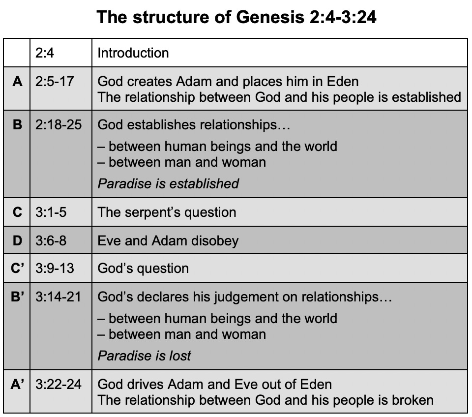 In terms of context, Genesis 3 forms part of “the account of the heavens and the earth when they were created” (Genesis 2:4ff). Within this account, the first of Genesis’ main sections, there are three distinct narratives: the Garden of Eden (Genesis 2:5-3:24), the murder of Abel (Genesis 4:1-16) and Cain’s family (Genesis 4:17-26). For the purposes of this discussion we shall focus on the first of these, an outline of which is set out in the table below. Like the Genesis prologue, the text of Genesis 2:4-3:24 as a whole can be considered as having a well-defined structure – in this case the symmetrical ABCDC’B’A’ form as shown in the left-hand column.