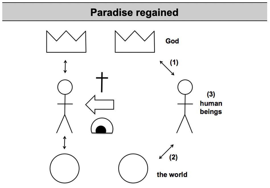 Because of the death and resurrection of Jesus Christ, the consequences of God’s judgement can be reversed. There will come a time when God’s people will once again live in his beautiful and bountiful place under his perfect rule. But this time it will be permanent. The picture is of paradise regained. The numbers in the diagram below correspond to the headings (1), (2) and (3) above.